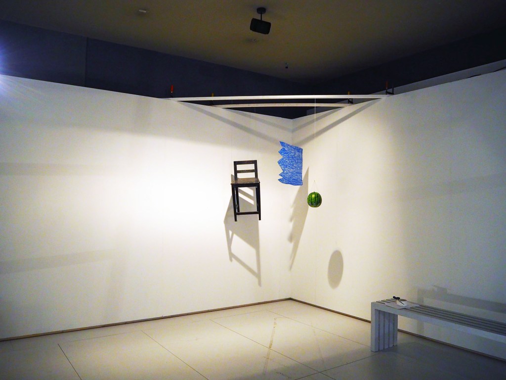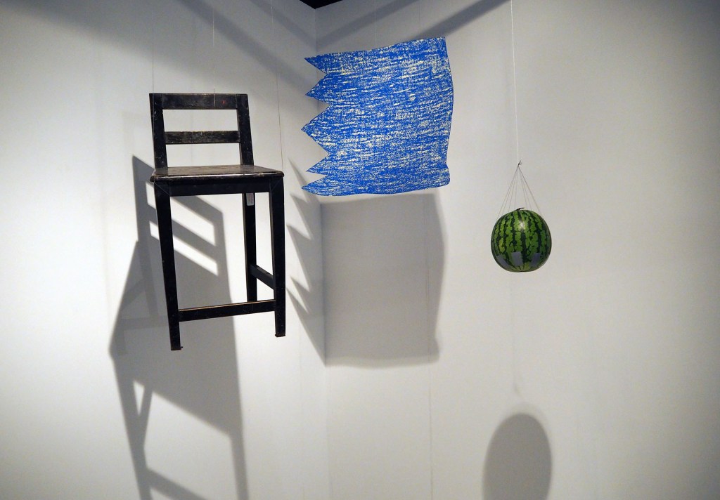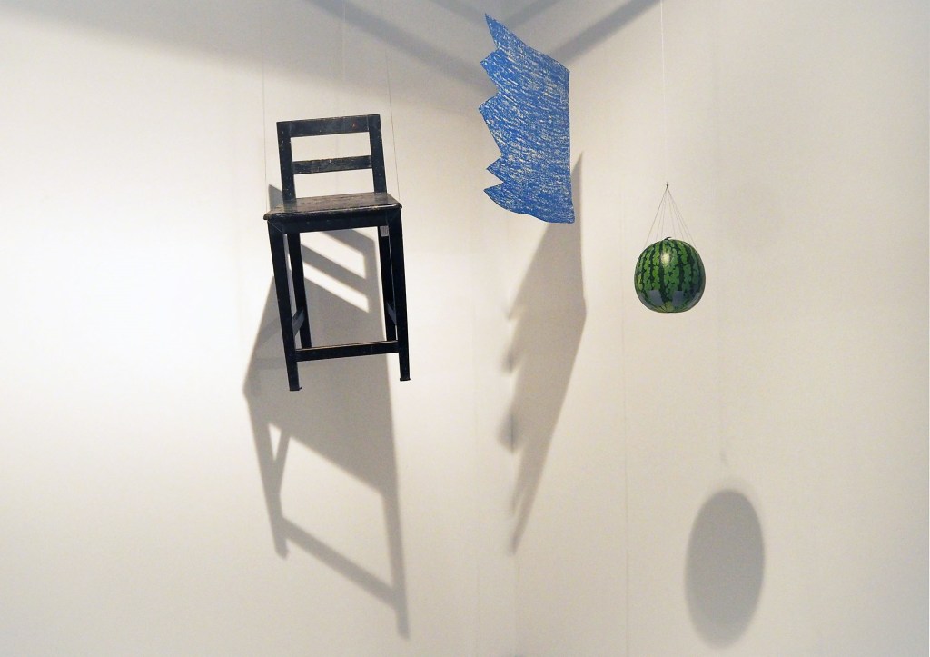 Installation with watermelon, wooden stool, cardboard shape (crayon on cardboard), wire thread, tape, spotlights
