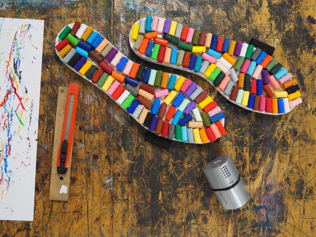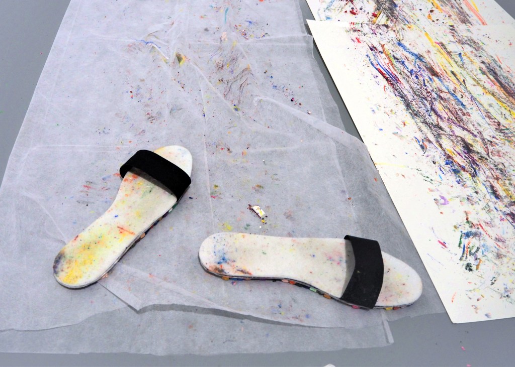 Your feet are the tip of my pencil , 2017, one pair of drawing sandals (size 42), oil pastels on paper (13 sheets, Dorée, 50 x 70 cm), oil pastels on garden fleece (110 x 910 cm)