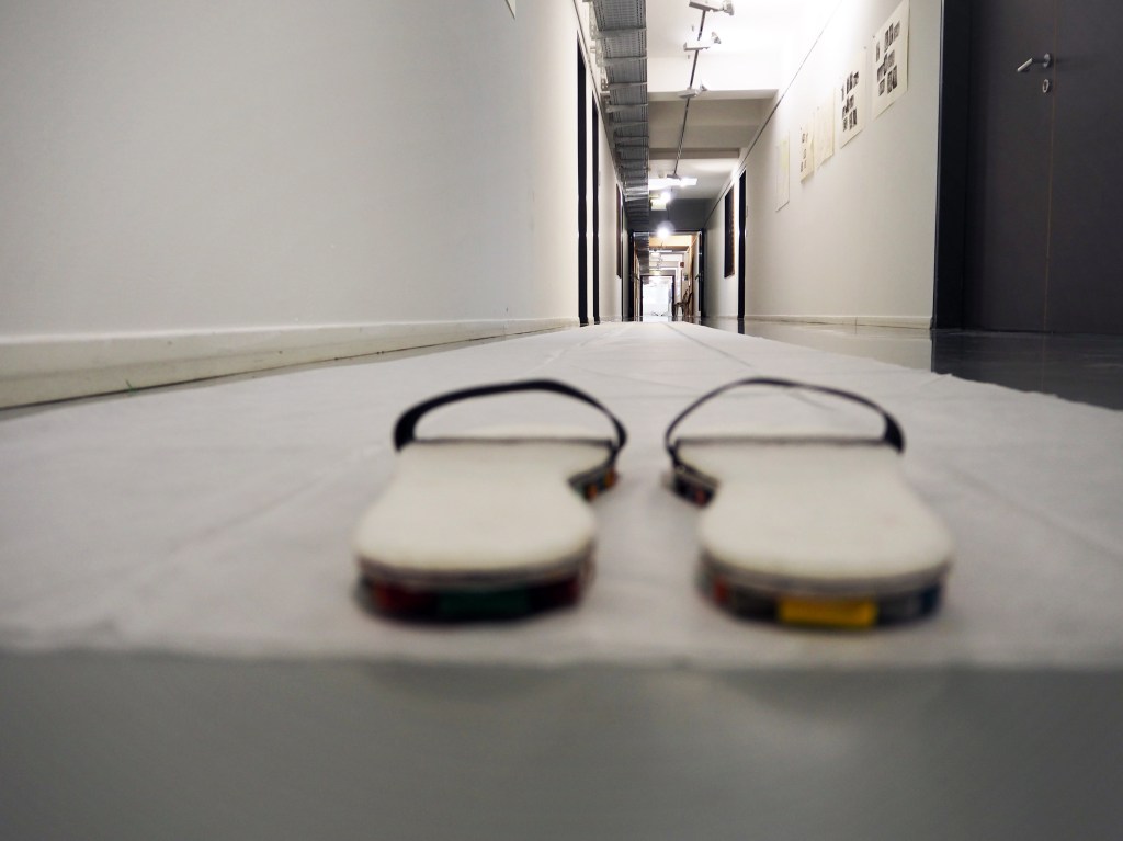 Walking as artistic practice has found its way in our weekly discussions, involving reading relevant texts, and meeting practicing artists (e.g.: Brigitte Kovacs). This project captivated the traces of participating visitors during the yearly Open House / Rundgang. The participants would walk along a narrow corridor, on two different materials (fleece and paper), reacting to the fragility of the crayon-soled shoes, shifting the focus from drawing with hands to drawing with feet.